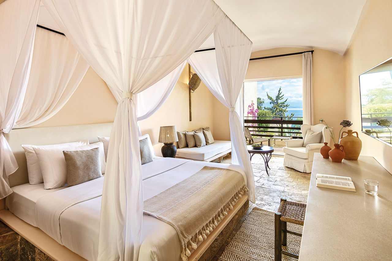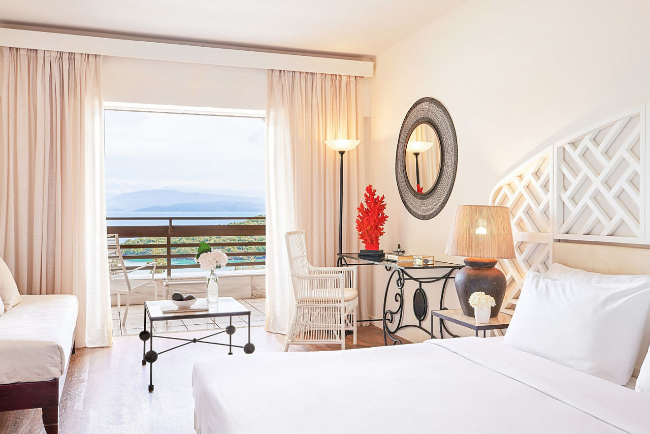 Enjoy tranquillity in Corfu when you unpack your case at Grecotel Daphnila Bay. It?s located right on the beachfront, so you can relax in the rays before taking a dip in one of two pools and admiring the gorgeous views. As for wining and dining, five restaurants including exquisite beachfront dining and seven bars? Yes, please! With an on-site spa, air-conditioned gym and a children?s club, there?s something for everyone here. Plus, how about paying a visit to Danilia Park & Museum? It?s the replica village where most of The Durrells was filmed. It?ll be a trip to remember.Double rooms with Garden View sleep up to 3 and have bathroom with bath with shower attachment, hairdryer, bathrobe and slippers, air conditioning, fridge, tea and coffee making facilities and balcony or terrace. Double rooms with Sea View, Bungalows with Side Sea View and Family Bungalows with Garden views are also available.
